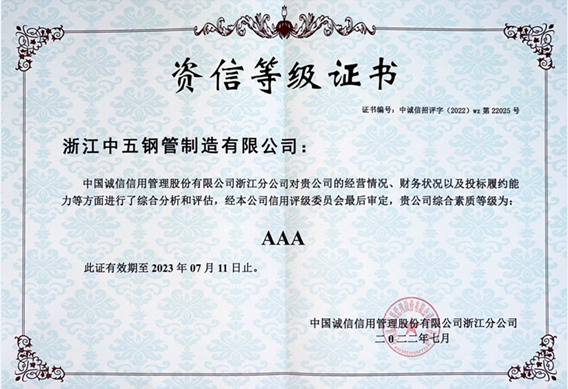公司因在誠信方面的突出表現,在2022.7被中國誠信信用管理股份有限公司浙江分公司評為資信等級AAA。